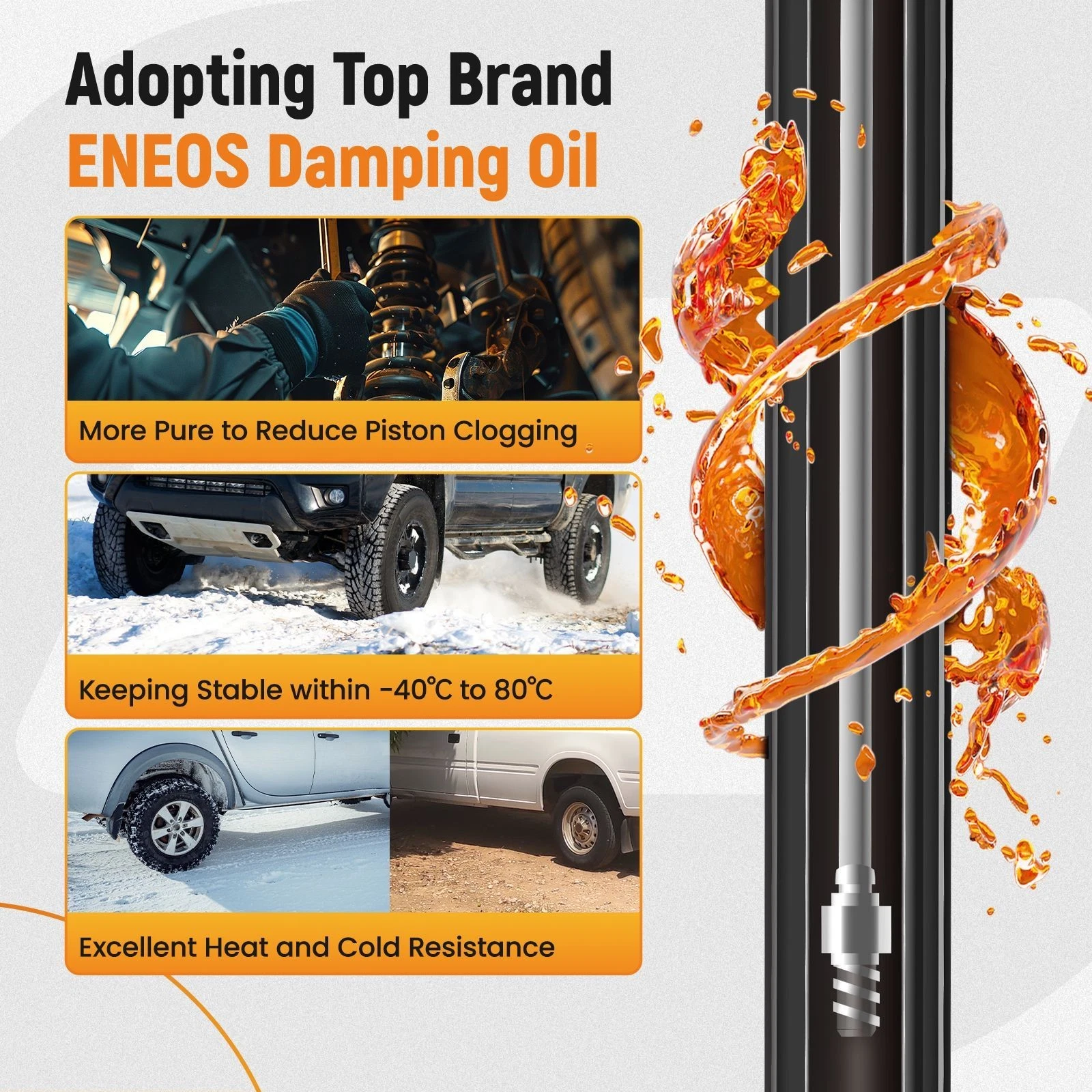 1.The strut assembly uses Japanese ENEOS brand damping oil to ensure that the shock absorber can maintain stable function at -40°~80°.